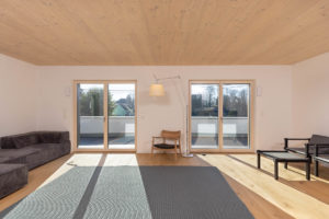 Interieurfotografie eines minimalistischen Wohnzimmers mit Holzboden bei natürlichen Licht.