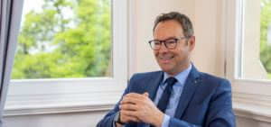 Portraitbild eines Mannes im blauen Anzug vor Fenstern.