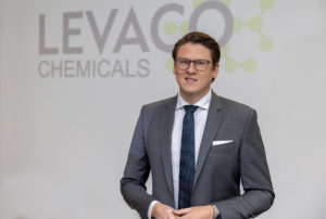 Portraitbild eines Mannes im grauen Anzug vor Levaco Chemicals Logo.