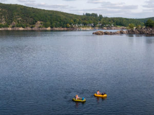 Eifel Rursee, Zwei Leute im Paddelboot auf einem Gewässer mit Felsen, Booten und Wald im Hintergrund.