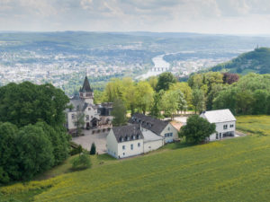 Architekturaufnahme eines Hotels in Trier mit Fluss und Stadt im Hintergrund.