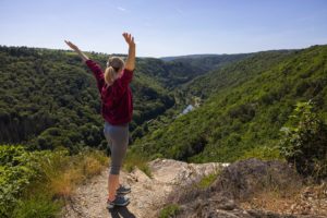 Wanderin blickt auf ein Tal und genießt Natur und Freiheit