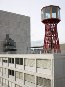 Architekturaufnahme eines grauen Gebäudes mit rotem Turm in Zurich.